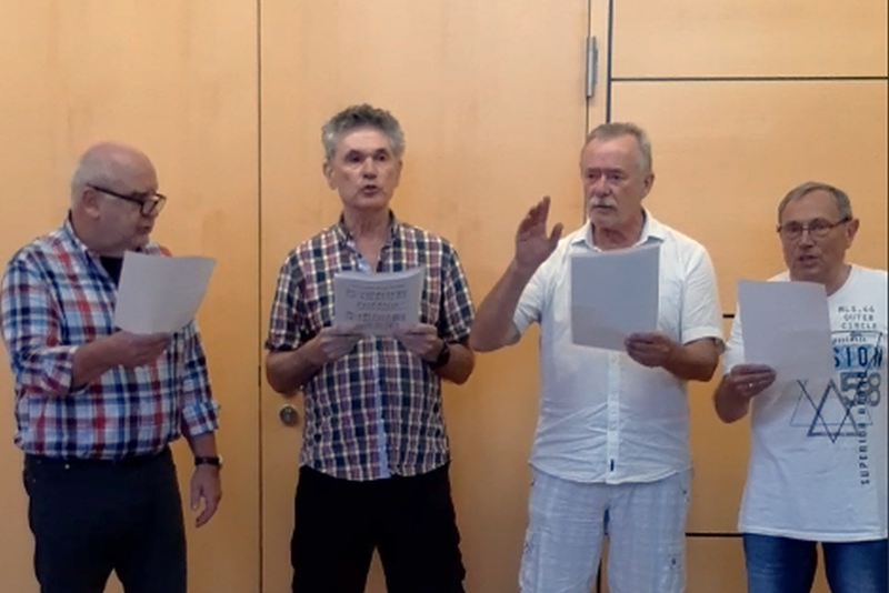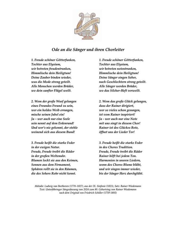 Das Sommerfest unseres Chorleiters findet immer nahe an seinem Geburtstag statt. Somit hat er am Vortag seines 80. Geburtstages mit uns gefeiert, mit den Sängern, Sängerfrauen und Freunden. Die Sänger lassen sich immer eine Überraschung als Geschenk für den Chhorleiter einfallen als Dankeschön für seinen unermüdlichen Einssatz. Diesmal hat unser "Dreigesang" eine "Ode an die Sänger und ihren Chorleiter" dargeboten (eine Abwandlung von Beehthovens "Ode an die Freude", siehe unten). Unser Rainer hat sich darüber sehr gefreut und hat sich das Lied nochmal bei der nächsten Chorprobe gewünscht. Es wurde angedeutet, dass die Darbietung noch besser als beim Sommerfest war.