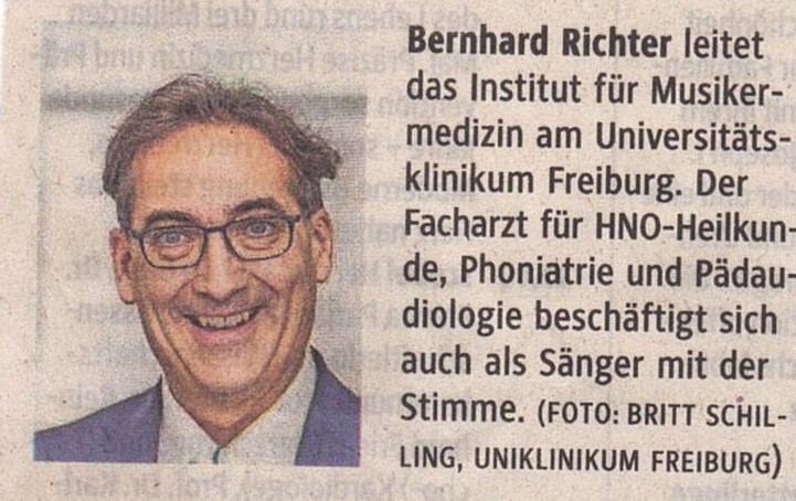 Gut gelaunt geht Bernhard Richter ans Telefon und redet direkt drauflos. Früh zeigt sich eine Eigenheit: Er demonstriert immer wieder stimmlich, was er erklärt, vom Stimmbruch bis zum sogenannten Greisendiskant, das plötzliche Umschlagen in die Fistellage. Richter sang als Kind bei den Stuttgarter Hymnus -Chorknaben, studierte später Gesang, parallel Medizin. Heute ist er Stimmarzt und Sänger. Er leitet am Universitätsklinikum Freiburg das Institut für Musikermedizin. Über die Physiologie der Stimme hat er Bücher und Filme veröffentlicht.